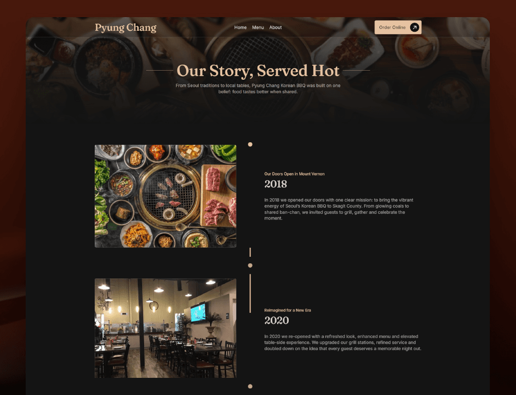 Pyung Chang Korean BBQ needed a website that looked premium, worked fast, and converted local searchers into guests. I built a mobile focused experience that highlights their food, makes it easy to navigate, and performs well for restaurant specific search results. The site is structured to integrate smoothly with online ordering platforms and to support strong SEO signals that help Pyung Chang rank when customers look for Korean BBQ nearby. Every page reflects the quality of the brand and is designed to increase interest, streamline ordering, and bring more people through the door. The designed link below is non-public sample.