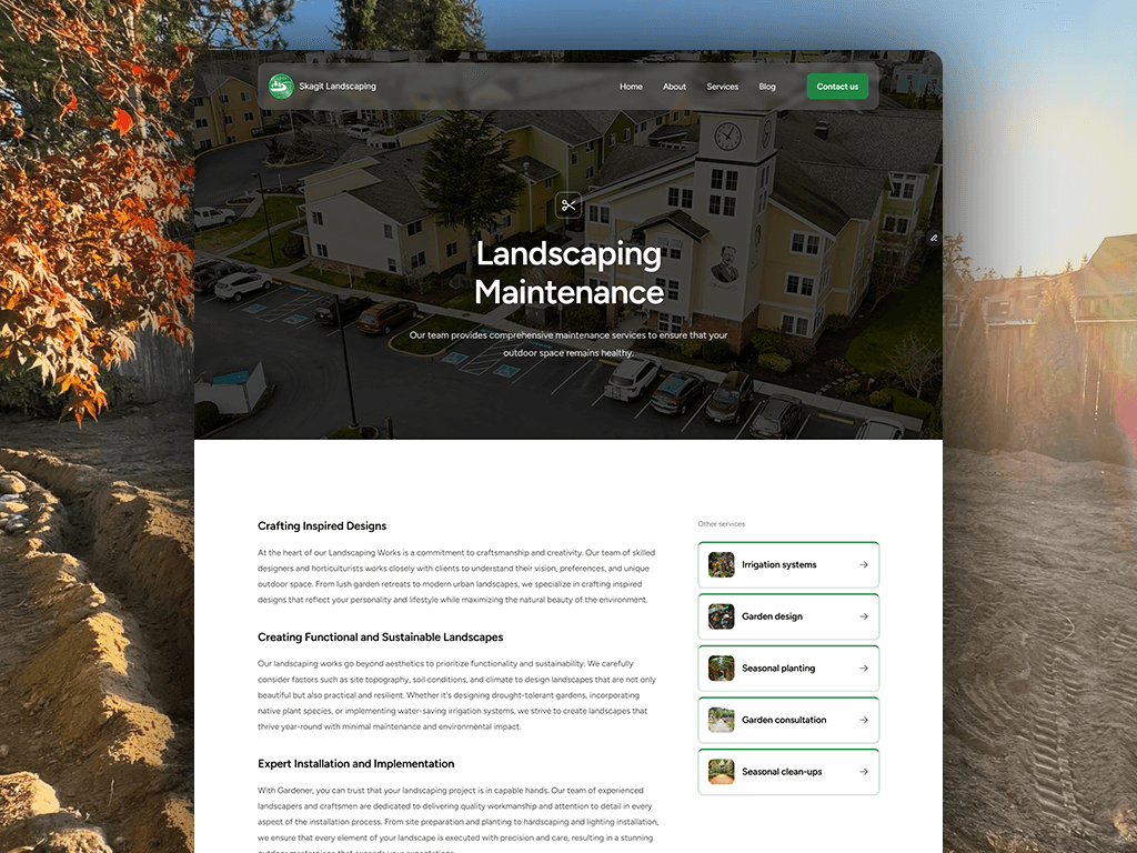 Landscaping companies need a website that does two jobs at once: prove the quality of their work and turn local search traffic into booked estimates. For this project, I built a fast, mobile first site designed to generate leads from homeowners actively searching for landscaping services nearby. The layout puts portfolio proof front and center with bold project photos, clear service pages, and before and after style sections that build trust quickly. Every page is structured to support strong local SEO signals so the business can show up for high intent searches like “landscaper near me,” “yard cleanup,” and “paver patio installation” in their service area. The experience is simple to navigate, quick to load, and built around conversion points like quote request forms, tap to call buttons, and service area prompts.